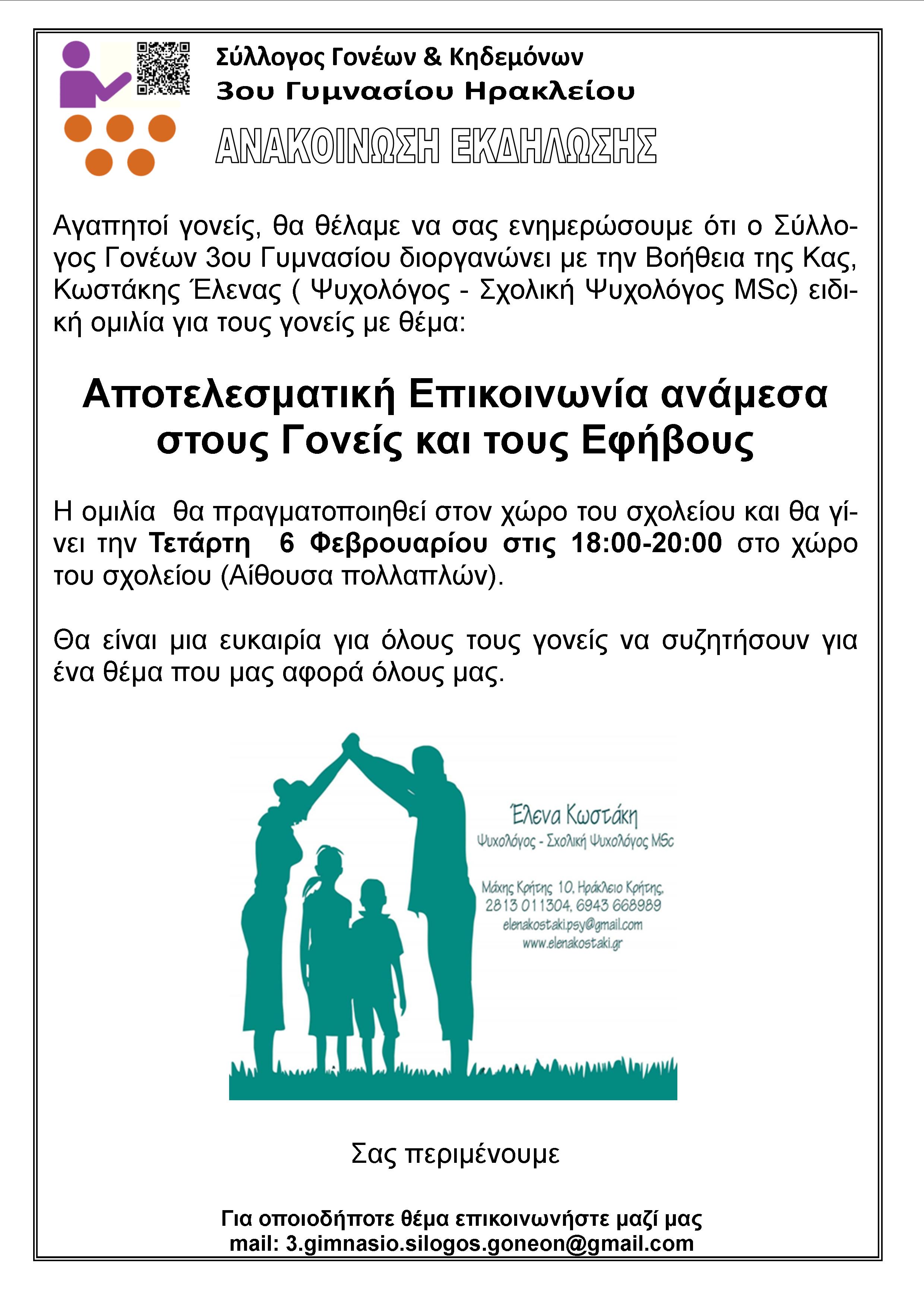 Ομιλία με θέμα: “Αποτελεσματική Επικοινωνία ανάμεσα στους Γονείς και τους Εφήβους” Δημοσιεύτηκε · 17 Ιανουαρίου 2019
