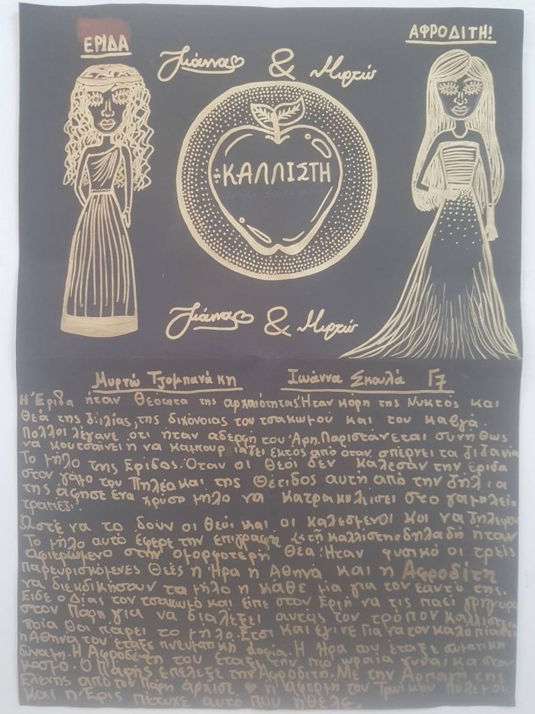 Στο πλαίσιο του μαθήματος της Γ? Γυμνασίου “Ελένη”, οι μαθήτριες Μυρτώ Τζομπανάκη και Ιωάννα Σκουλά του τμήματος Γ7 εκπόνησαν την εργασία αυτή εμπνευσμένες από την αρχαία ελληνική μυθολογία.