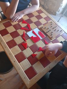 Ιδιαίτερα ευχάριστη ήταν η συμμετοχή των μαθητών σε αρχαία ελληνικά παιχνίδια και γρίφους, όπως τα γεωμετρικά παιχνίδια διαμελισμού (παζλ τύπου tangram), όπου κλήθηκαν να συνθέσουν σχήματα καλλιεργώντας τη λογική σκέψη και τη φαντασία τους.